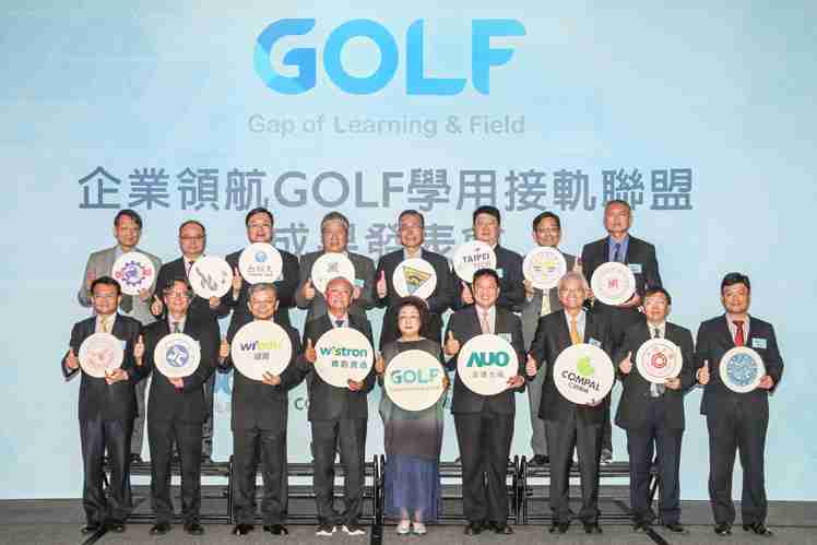 GOLF学用接轨联盟集结企业和学校的力量,,打造「学用合一、、、产学接轨」的创新合作平台 (前排左起:淡江大学副校长何启东、、、元智大学校长林启瑞、、、、纬育执行长许延岳、、、、纬创总经理暨执行长黄柏漙、、教育部政务次长范巽绿、、、CG电子董事长暨执行长彭双浪、、仁宝总经理暨执行长翁宗斌、、、、大同大学校长何明果、、圣约翰科大校长艾和昌;后排左起:明新科大校长林启瑞、、、龙华科大校长葛自祥、、台湾科大校长廖庆荣、、、中兴大学副校长郑政峯、、、中央大学校长周景扬、、台北科大副校长任贻均、、、中华科大副校长石大明、、、、明志科大校长刘祖华)
