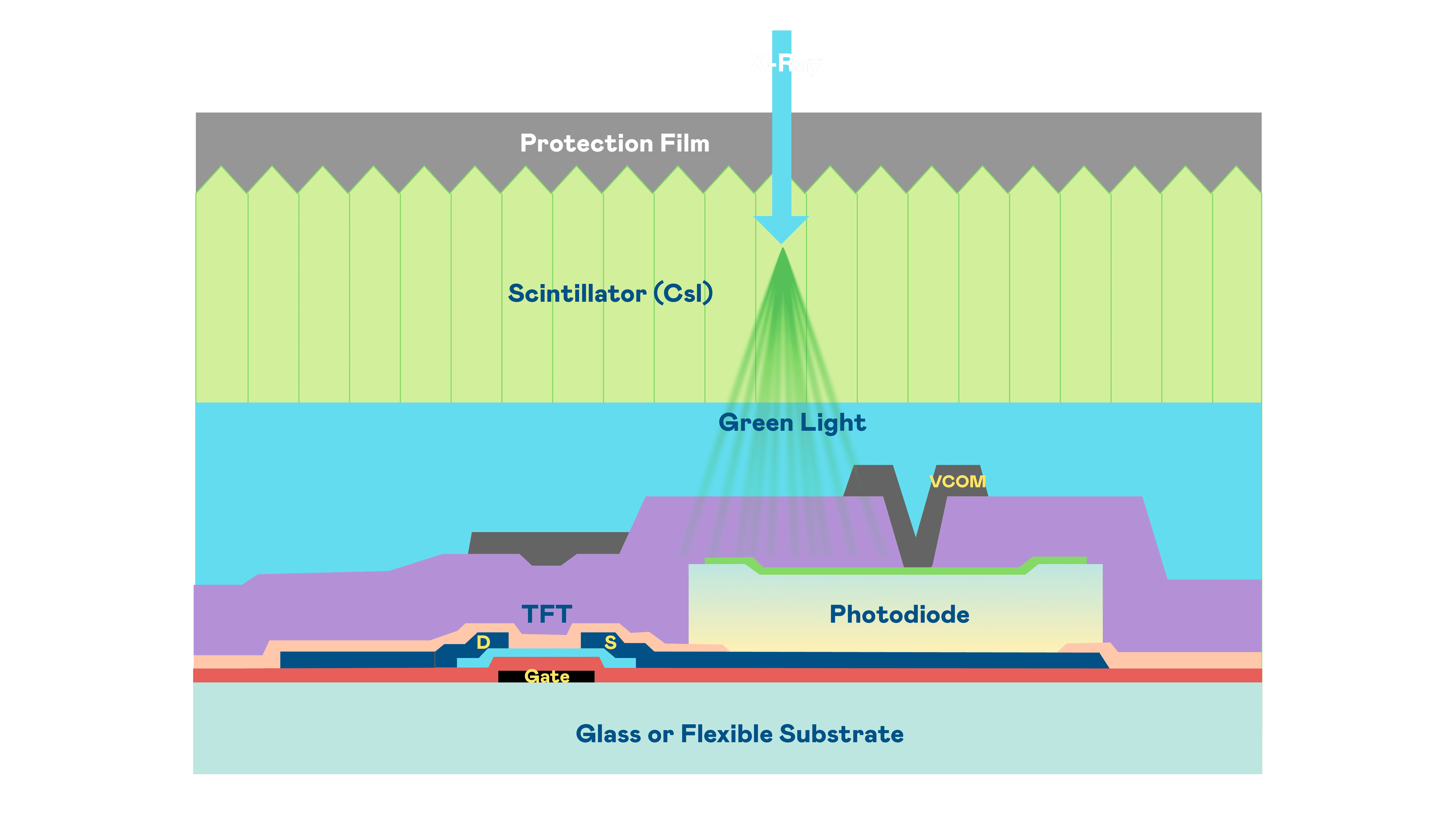 CG电子的X光影像感测阵列使用薄膜电晶体 (TFT) 作为每个像素的读取开关,,搭配光电二极体(Photodiode)的光电转换元件,,用以感测X光影像讯号。。